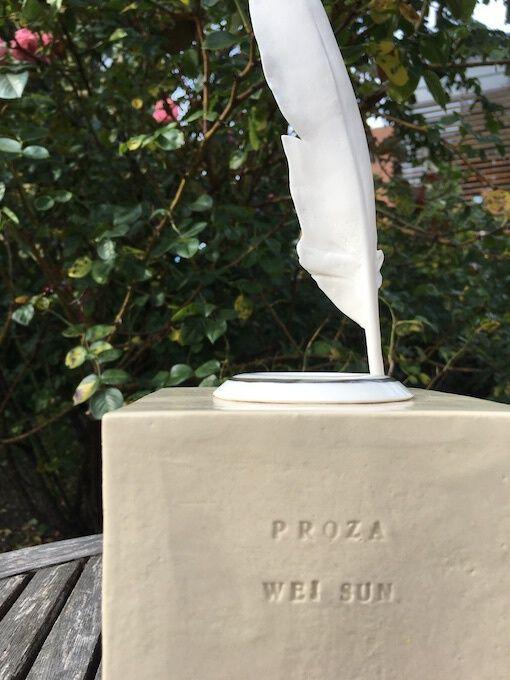 发表了一番获奖感言之后,我发觉手捧的这个奖杯非常特别……特别沉,这是所有奖杯在制作上力图达到的效果。然而,特别易碎,这个问题并非我一个人意识到了,所有获奖者都小心翼翼端着奖杯不敢造次,唯恐立刻碎在当场。主办方的朋友们也不断提醒我,这是全陶瓷的,尤其是上面插着的这一枚栩栩如生的羽毛笔,吹弹得破……